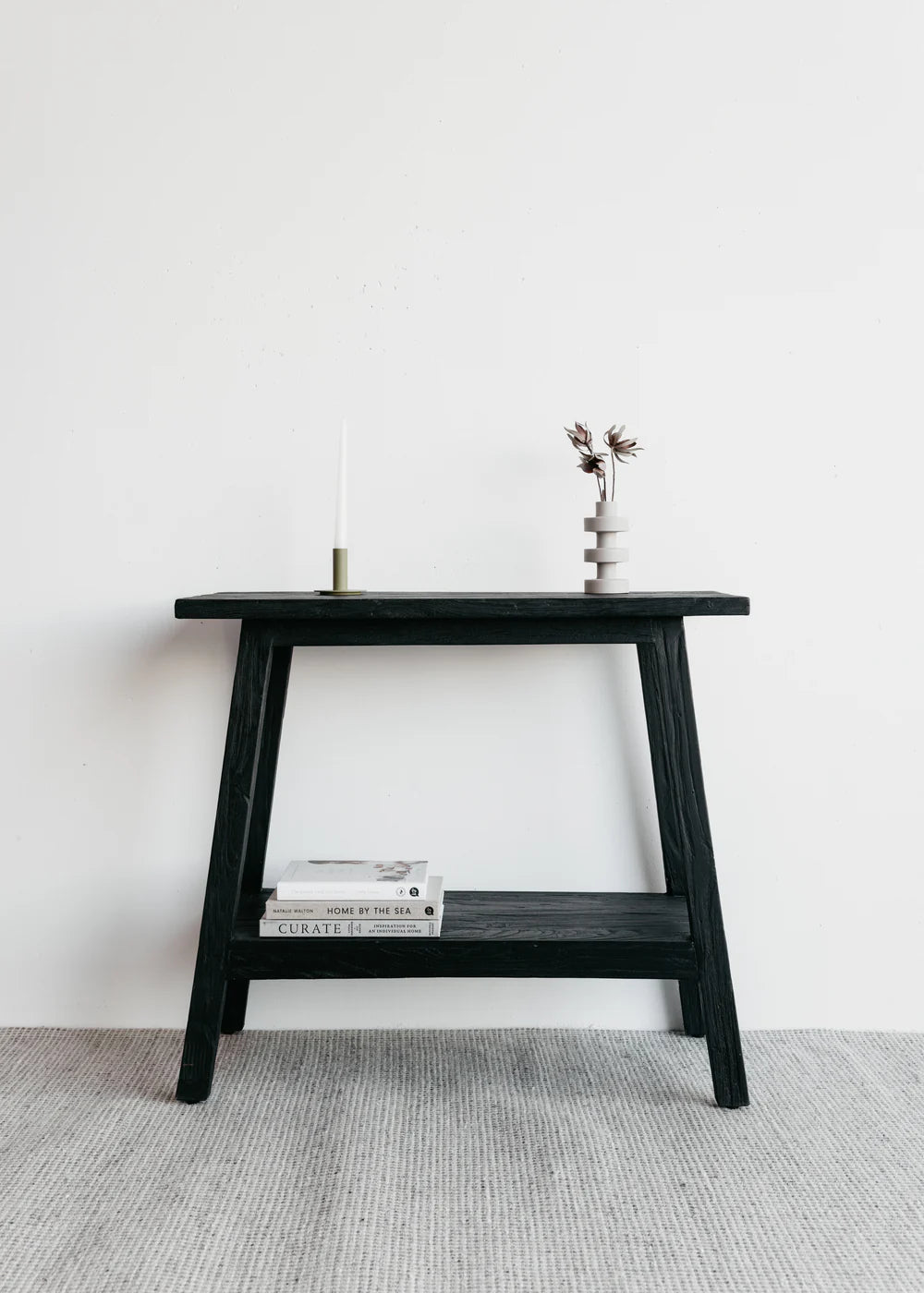 The Sara Teak Console by Kayu-Studio is hand crafted with reclaimed Indonesian teak aged over centuries. featuring two shelves, great for displaying your books and ornaments.